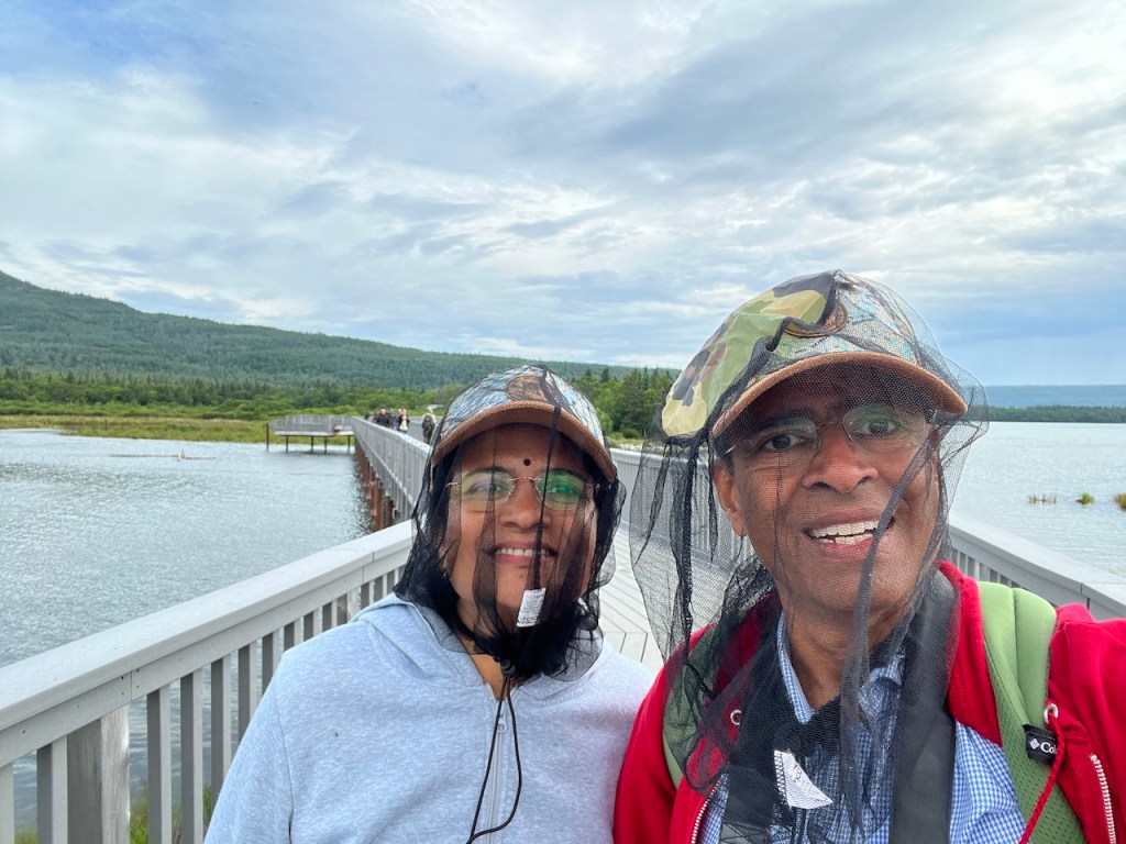 A major highlight of our Alaska trip was a day trip to Katmai National Park. We booked the trip through https://bristoladventures.com. We took an early morning flight from Anchorage to King Salmon Airport. A shuttle bus took us to the float plane harbor a few miles away. Then we boarded the float plane and landed on Naknek lake, which is the entry point for Katmai National Park. National Park officials gave us a full run down of how to go to Brook falls and how to manage any bear encounters.