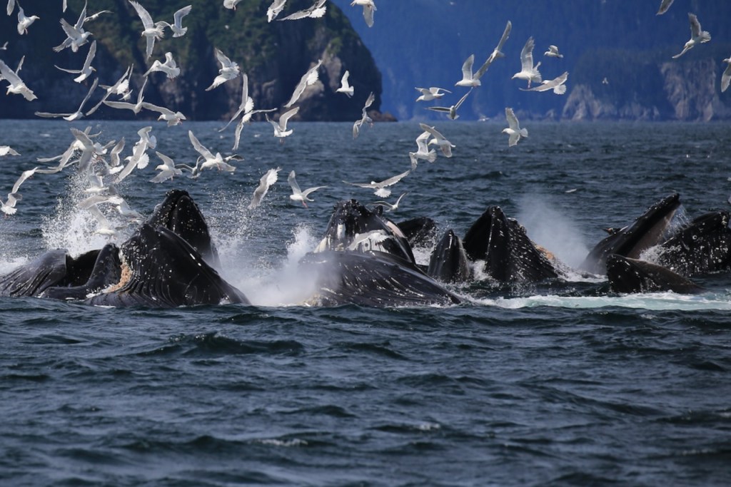 The next morning, we took the boat ride to tour Resurrection bay and Kenai Fjords. The wildlife sightings and the views of the glaciers and fjords were one of the best. We saw a large pod of Orcas (killer whales). Then we saw a large pod of humpback whales doing bubble net feeding. Per my research, only Alaskan whales have learned the technique of bubble net feeding. We stopped at Fox Island for dinner, where we saw river otters and a lot of birds.
