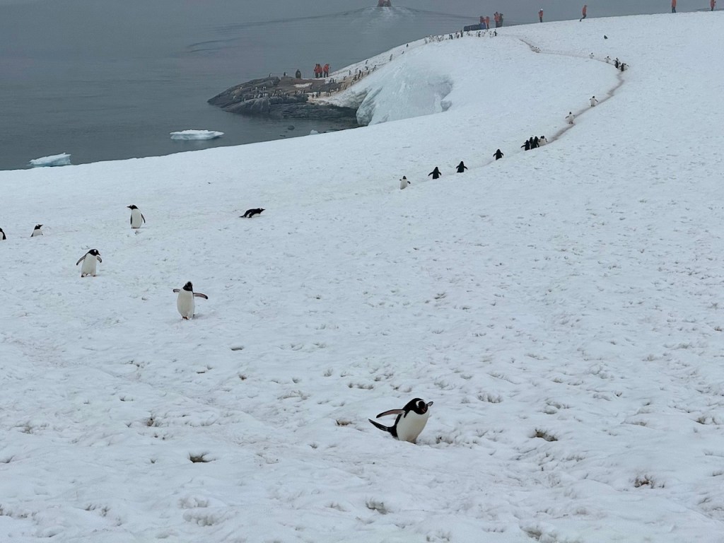 Day 7 of the expedition was hectic. First we had a landing at Petermann Island. We climbed a small mountain, and had some amazing views of the glacial ice. We saw a lot of penguins as well as a gull with a chick.