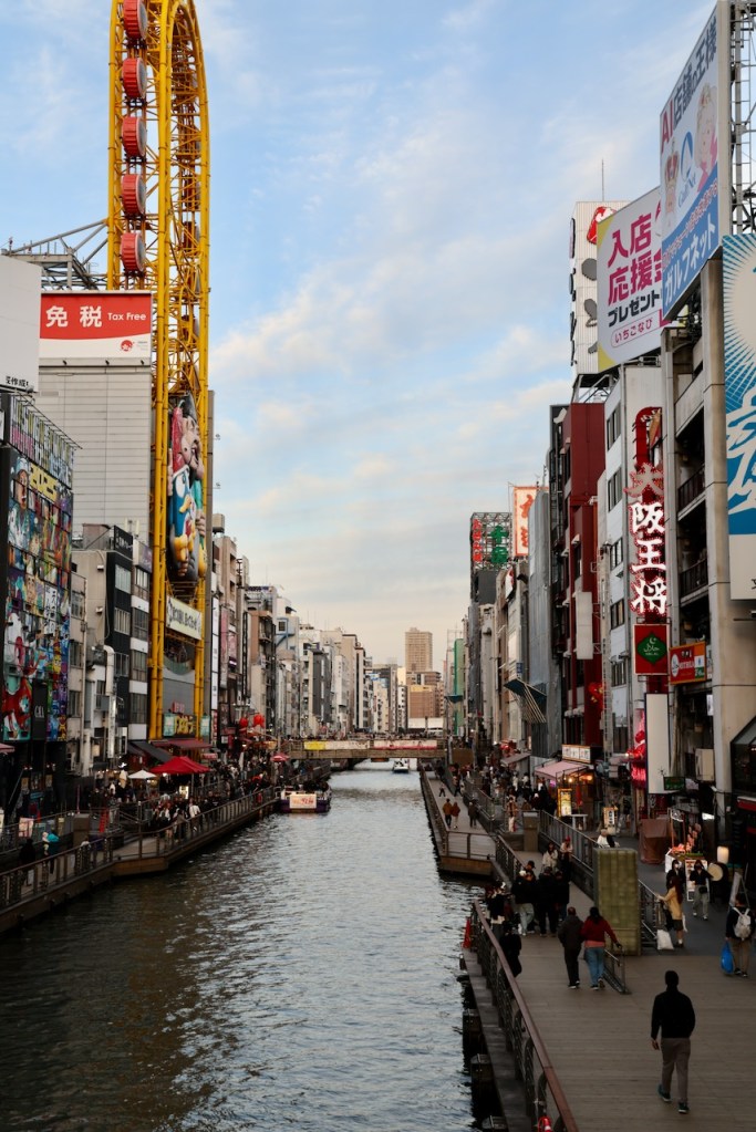 From Shitennō-ji, we walked to Dotonbori, a famous shopping neighbourhood in Osaka. Dotonbori was extremely lively, with lots of tourists. There are multiple attractions, e.g. Ferris Wheel, boat trip on the river.