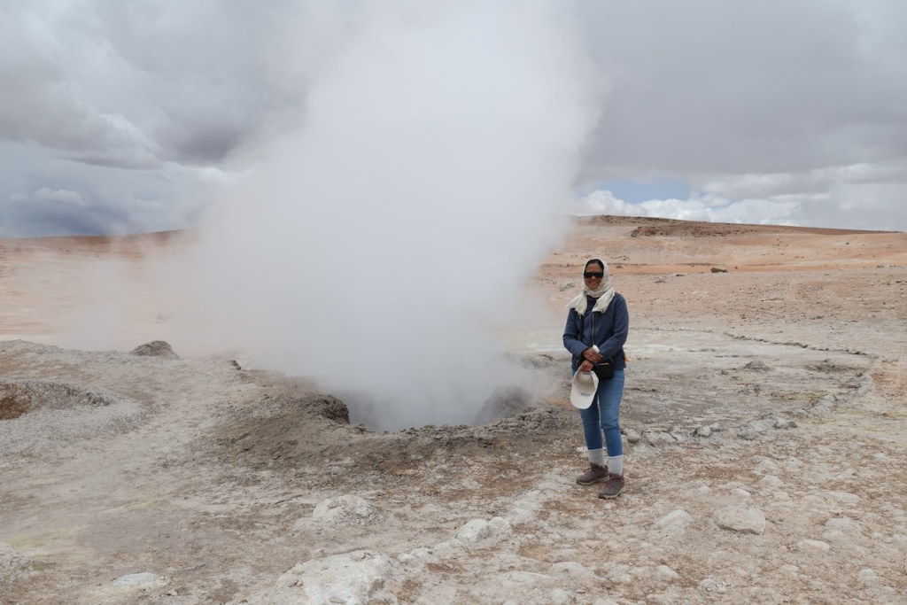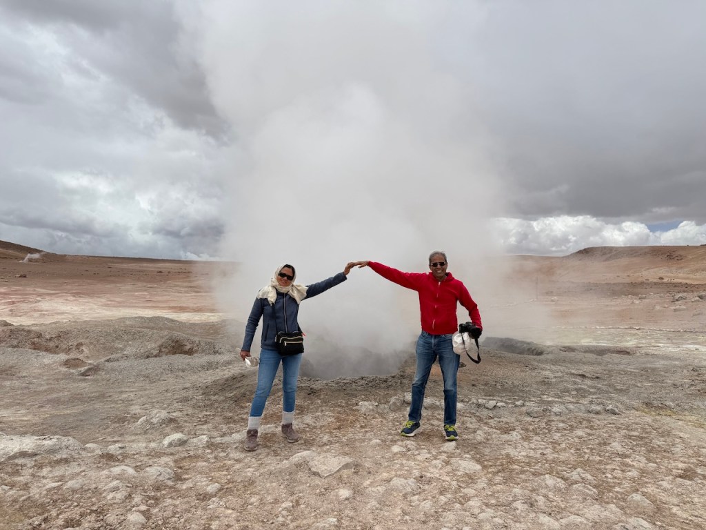 Our next stop was Sol de Maňana geysers (Morning Sun) which is at an altitude of 5000 meters. We spent a few minutes breathing from an oxygen cylinder before reaching the geysers. There are many geysers here, and the views were great.