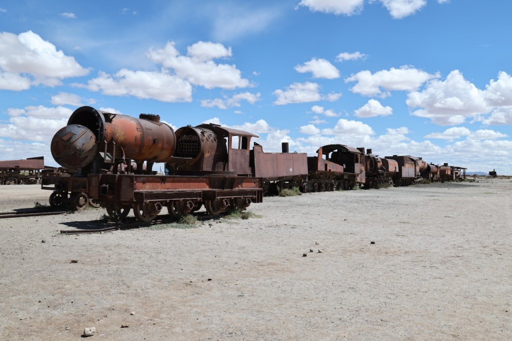 After lunch at San Cristobal, we arrived at Uyuni around 2.30pm. We first visited the Train Cemetery. The Uyuni Train Cemetery (Cementerio de Trenes) in Bolivia houses abandoned 19th and early 20th-century British steam locomotives and carriages that once serviced a booming mining industry, transporting silver and tin to Pacific ports. After the industry collapsed in the 1940s and plans for network expansion failed, the trains were abandoned, with harsh, salt-laden winds from the nearby salt flats accelerating their decay.