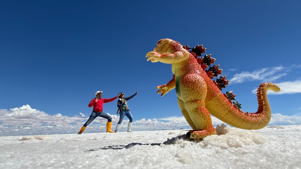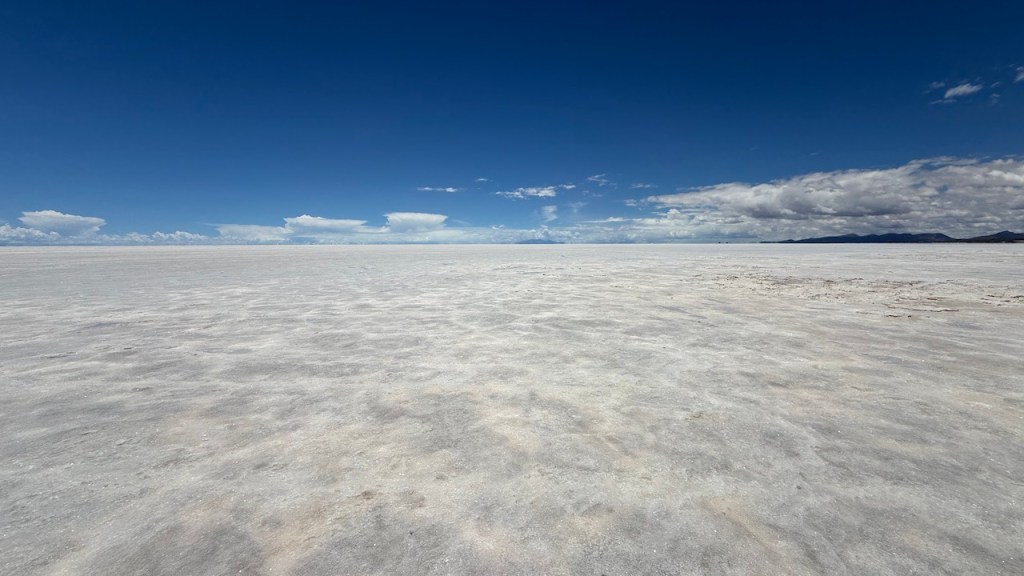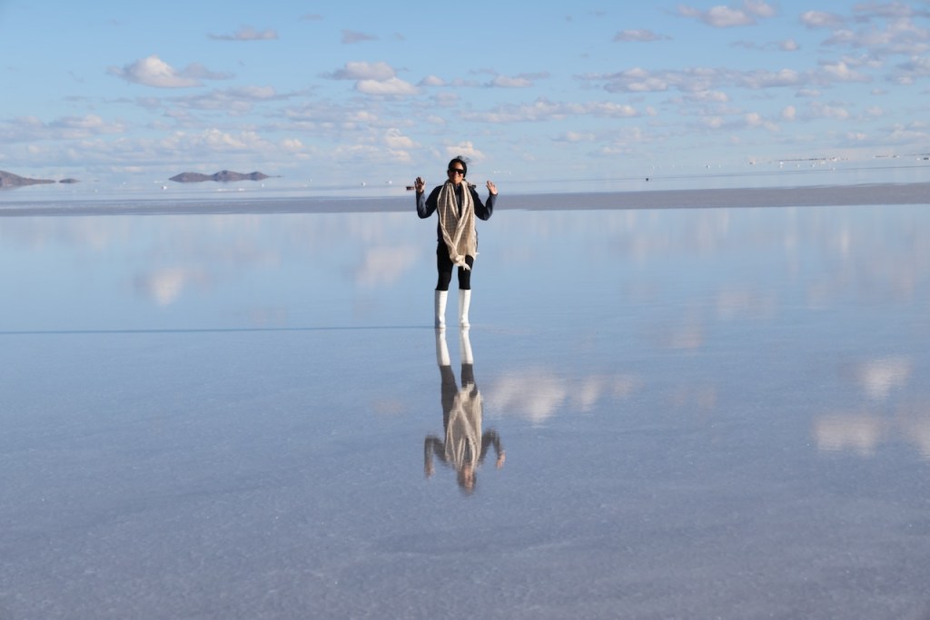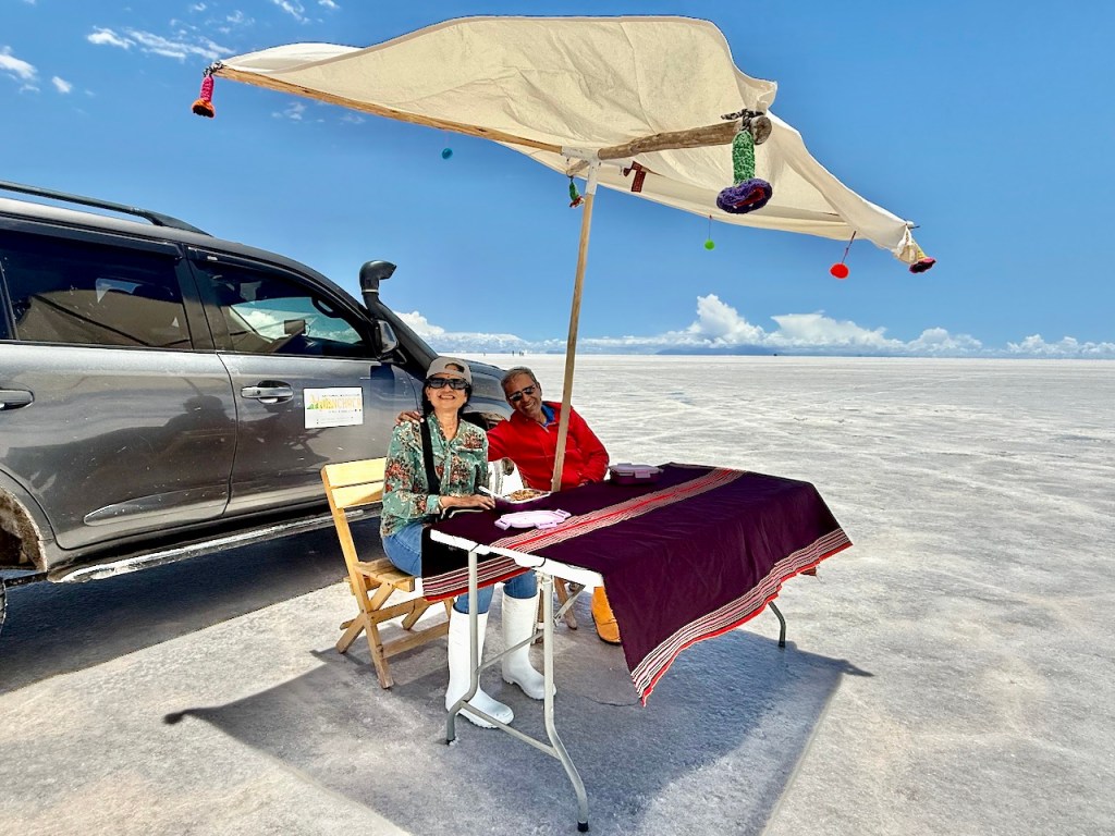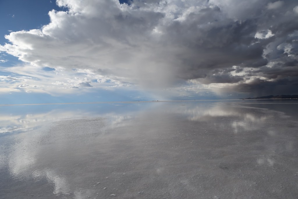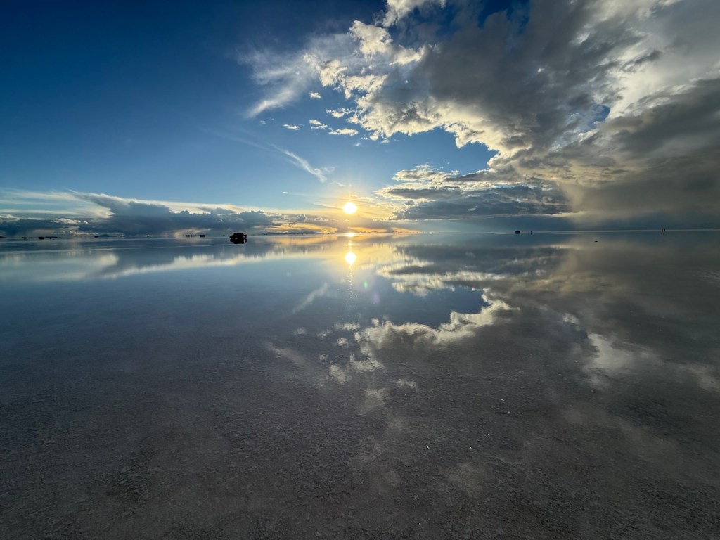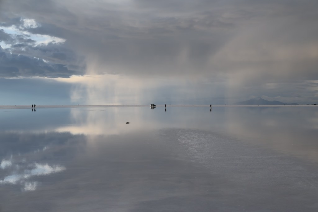 Around 5pm in the evening, we drove to Uyuni salt flats. The views were absolutely amazing. We really enjoyed watching the sun set slowly, and in the distance we could see rain clouds.